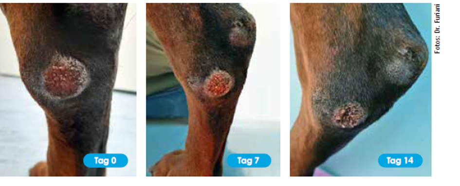 Vorgestellt wurde ein 5 Jahre alter Dobermann mit einer allergisch bedingten Hautentzündung (atopischer Dermatitis) und einer dauerhaften Darmerkrankung (chronischer Enteropathie). Aufgrund einer örtlichen in die tiefere Hautschicht eindringende Hautinfektion an den Druckpunkten (Liegeschwielen) wurde der Dobermann dem Tierarzt vorgestellt.